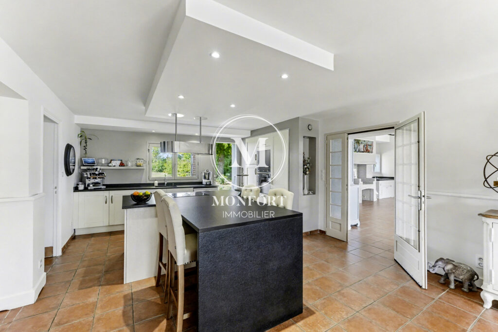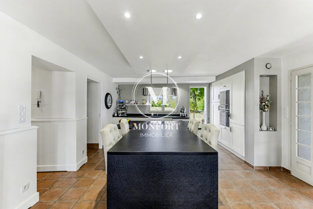 Dès l’entrée, les volumes impressionnent. Le rez-de-chaussée propose une première pièce à vivre d’environ 75m2 comprenant un séjour, un espace salle à manger et une cuisine ouverte, conviviale et lumineuse.Un second espace de vie de plus de 100 m2, baigné de lumière grâce à de larges baies vitrées, s’ouvre généreusement sur l’extérieur et invite naturellement à profiter du jardin et de la piscine.
