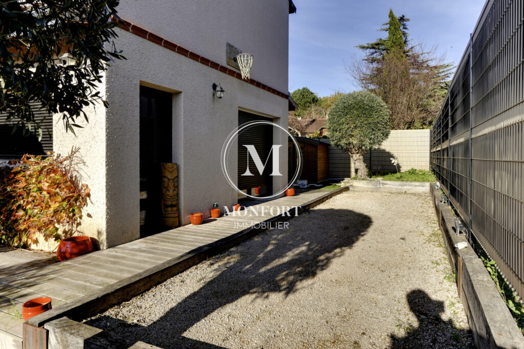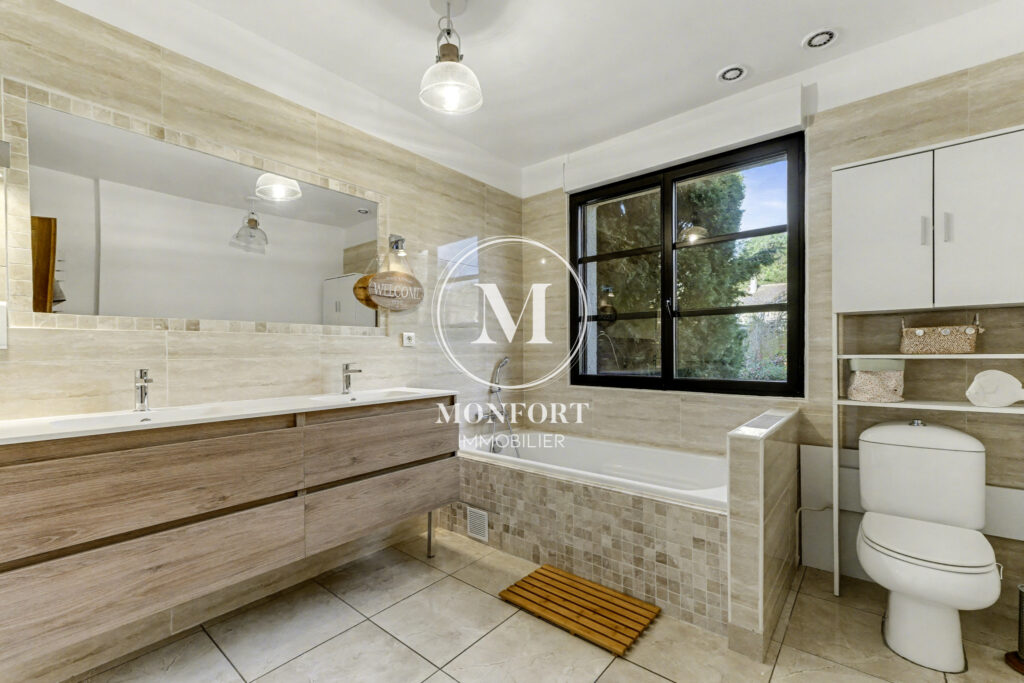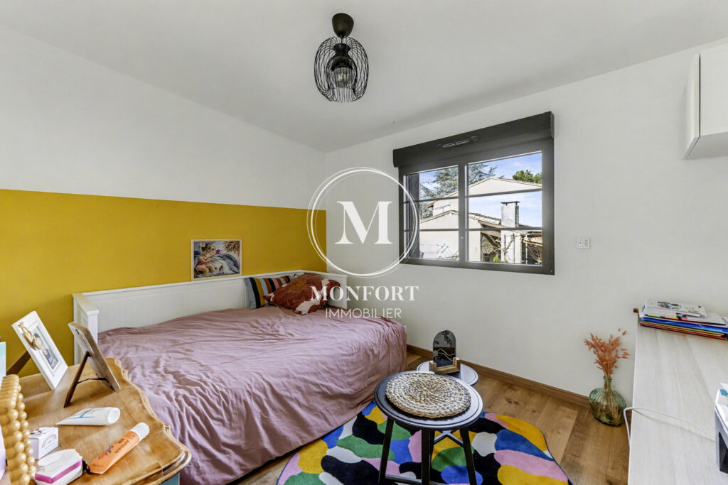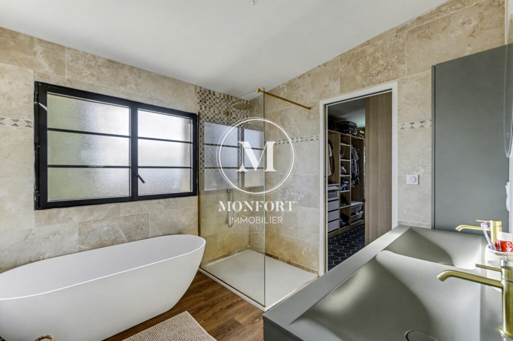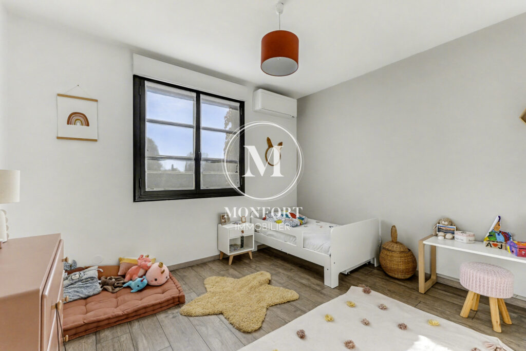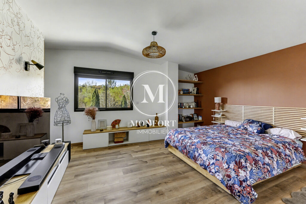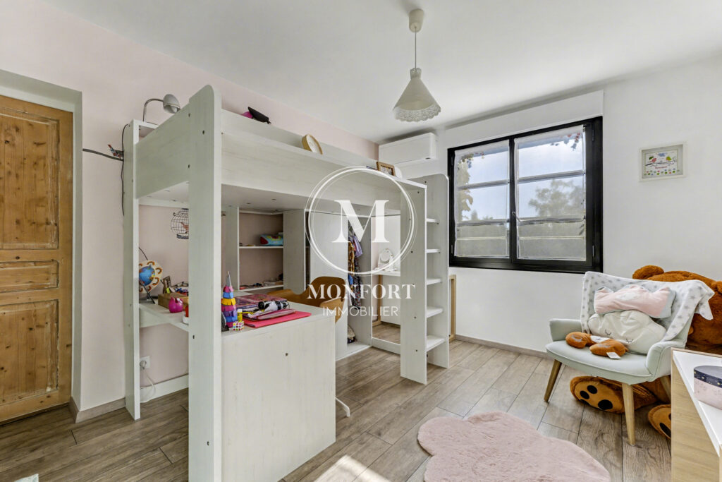 En niveau inférieur, la maison dispose également d’une chambre parentale avec dressing, salle d’eau et wc, offrant un espace indépendant et confortable.