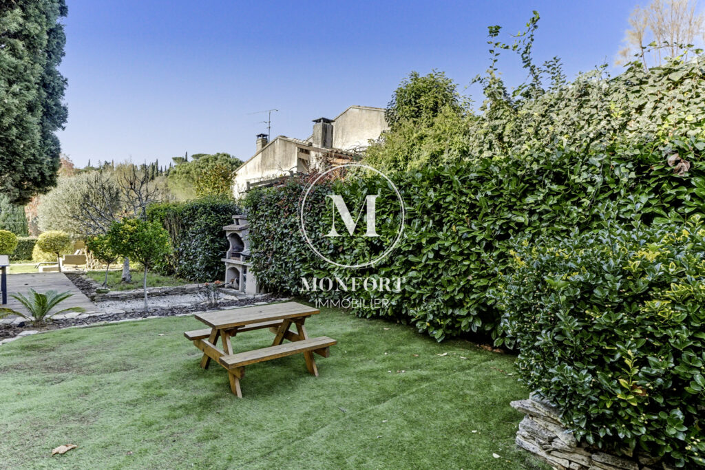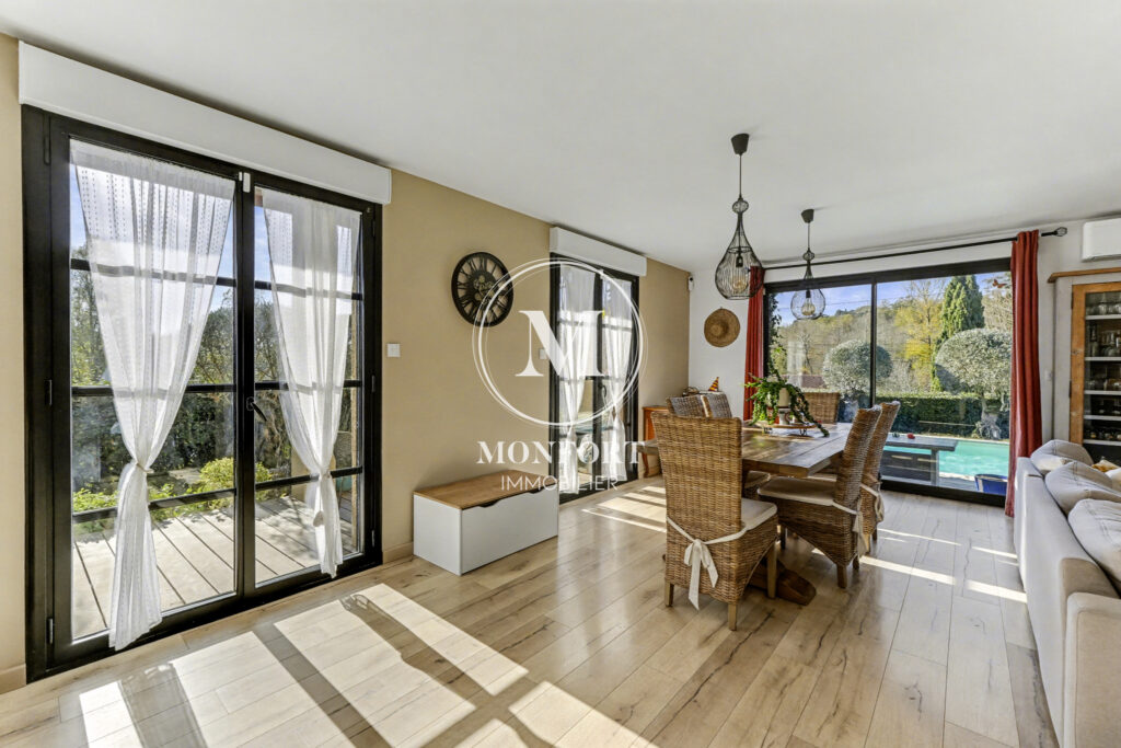 La maison bénéficie de belles prestations : double vitrage, volets roulants électriques, climatisation réversible, poêle à granulés. Très bien isolée et joliment décorée, elle affiche un excellent DPE en B.