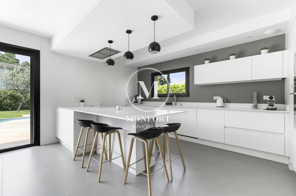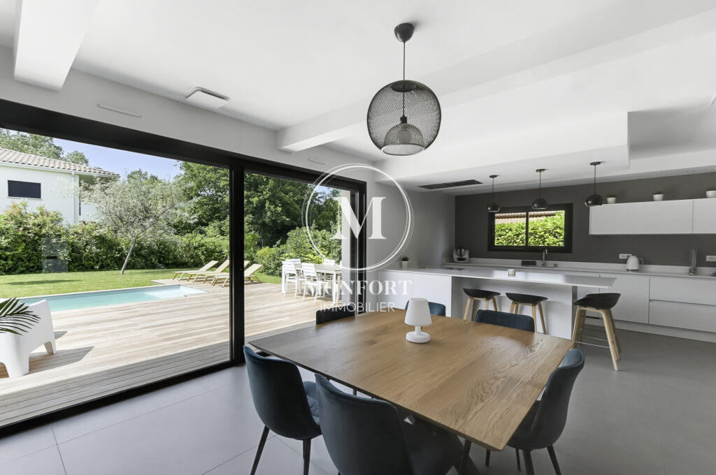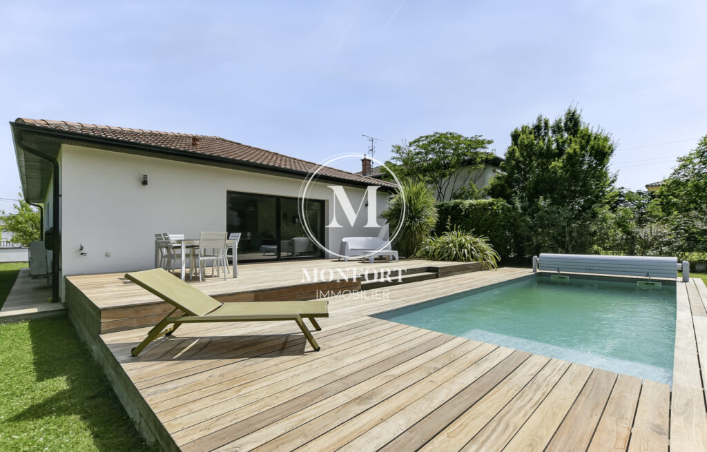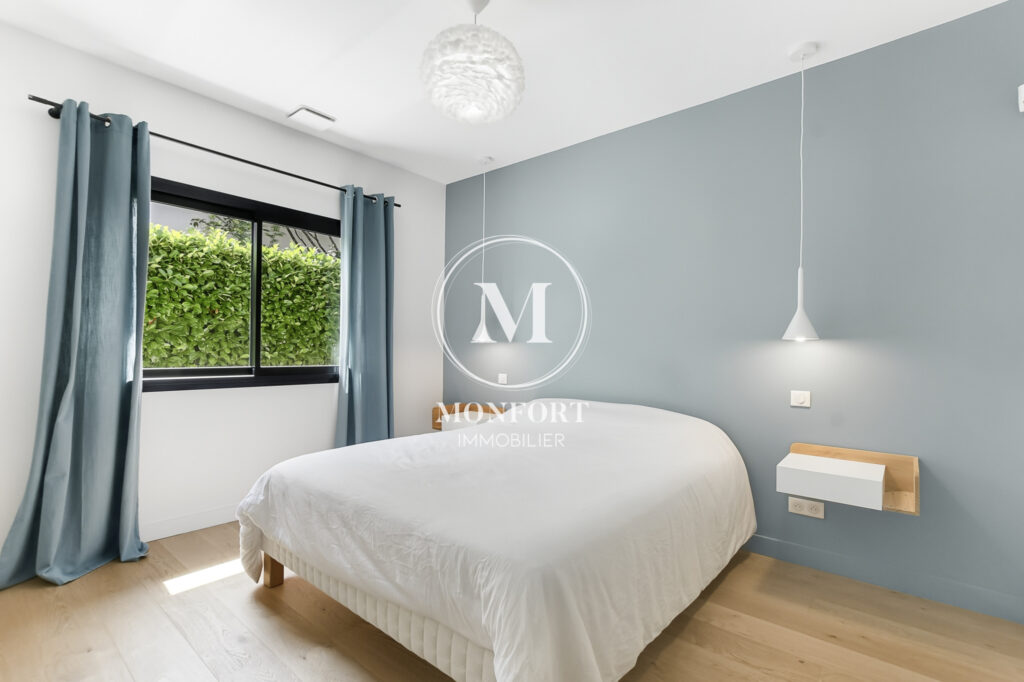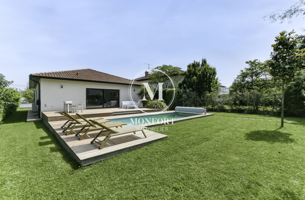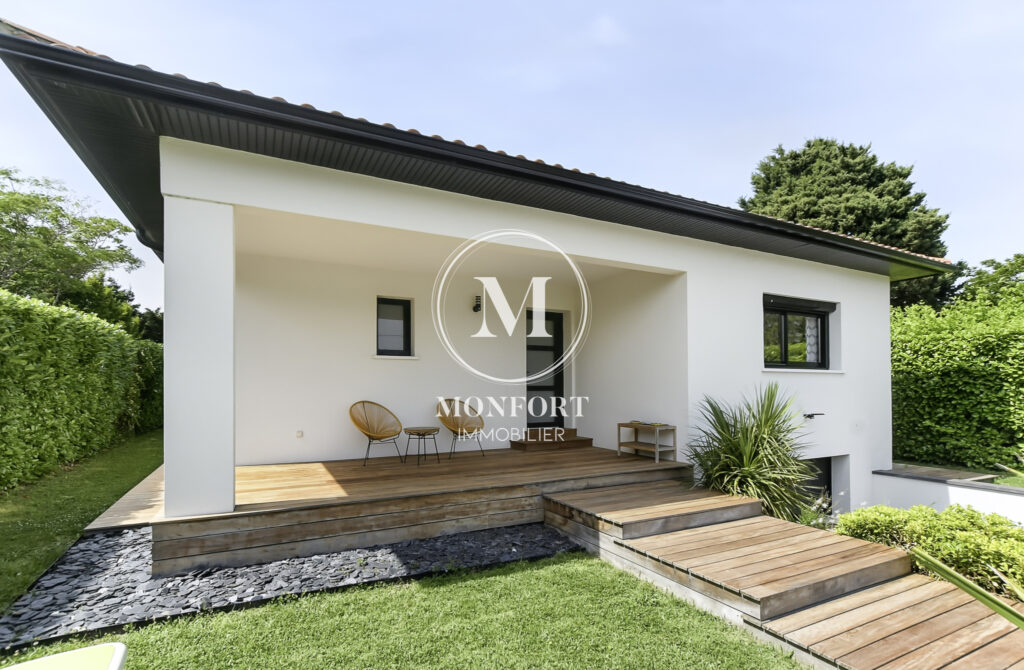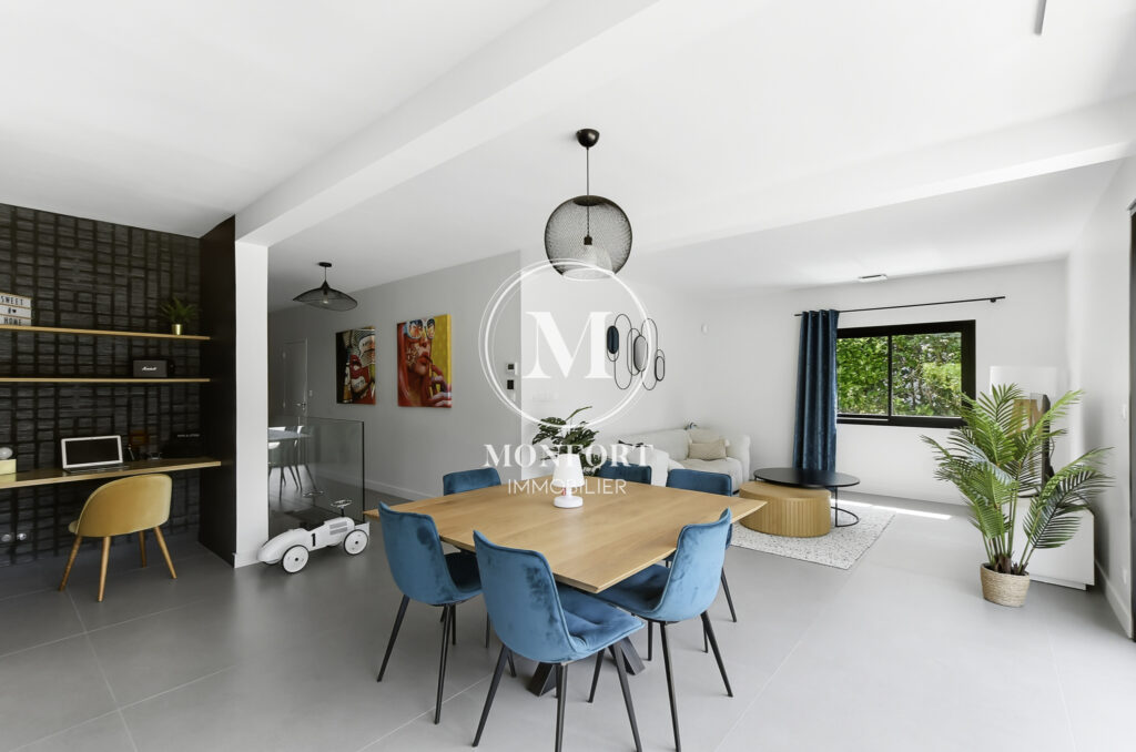 Prestations de qualité : climatisation réversible gainable Airzone, menuiseries aluminium, volets électriques centralisés, parquet en chêne massif, cuisine et salle de bain haut de gamme, isolation refaite, DPE en B.