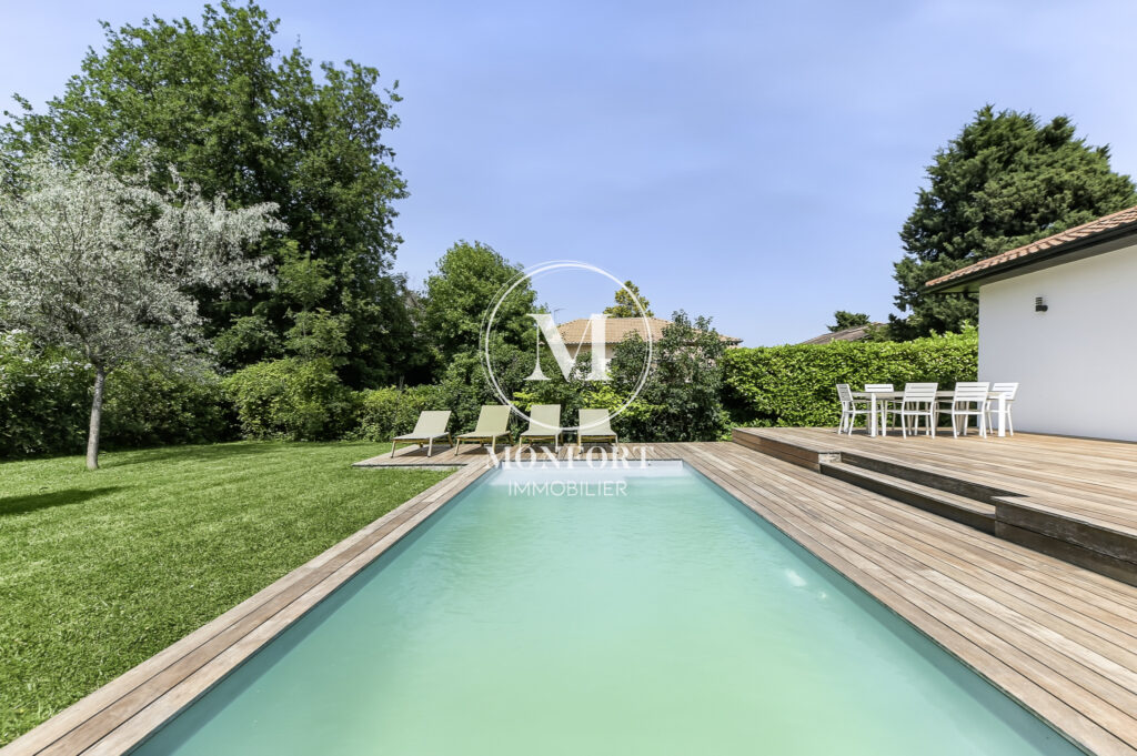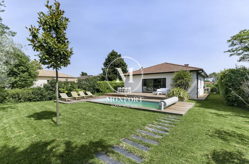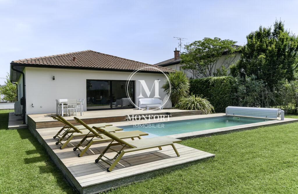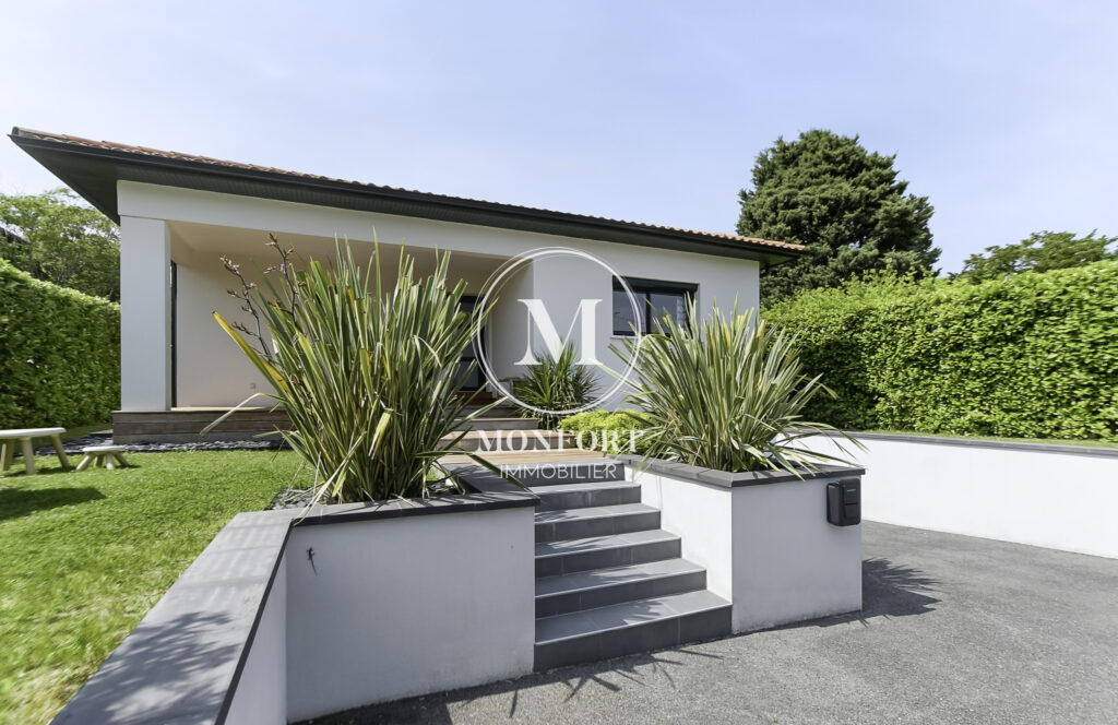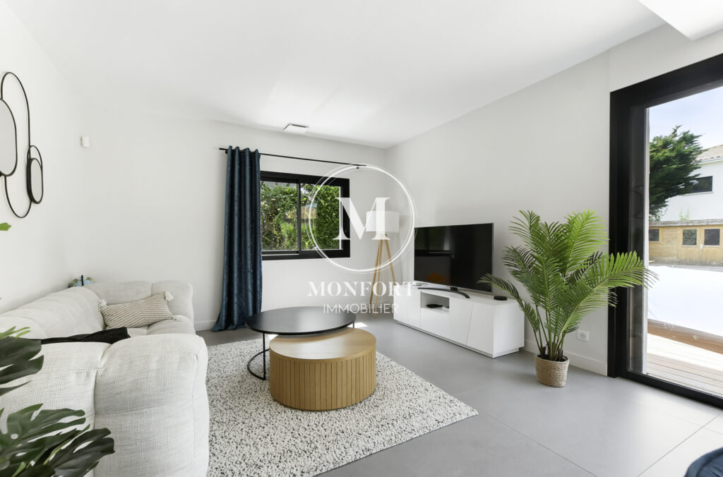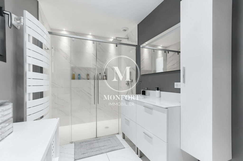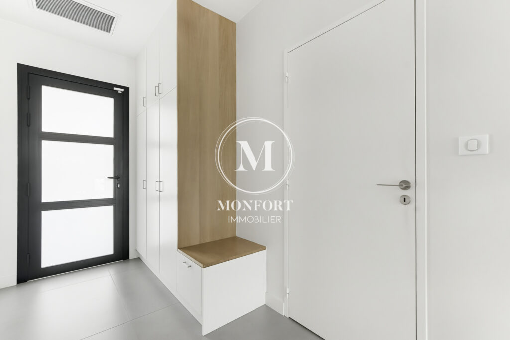 Prestations de qualité : climatisation réversible gainable Airzone, menuiseries aluminium, volets électriques centralisés, parquet en chêne massif, cuisine et salle de bain haut de gamme, isolation refaite, DPE en B.
