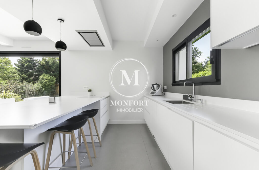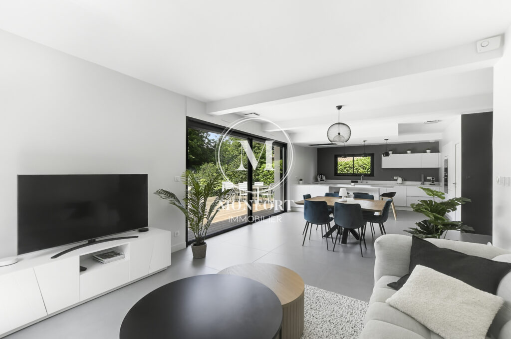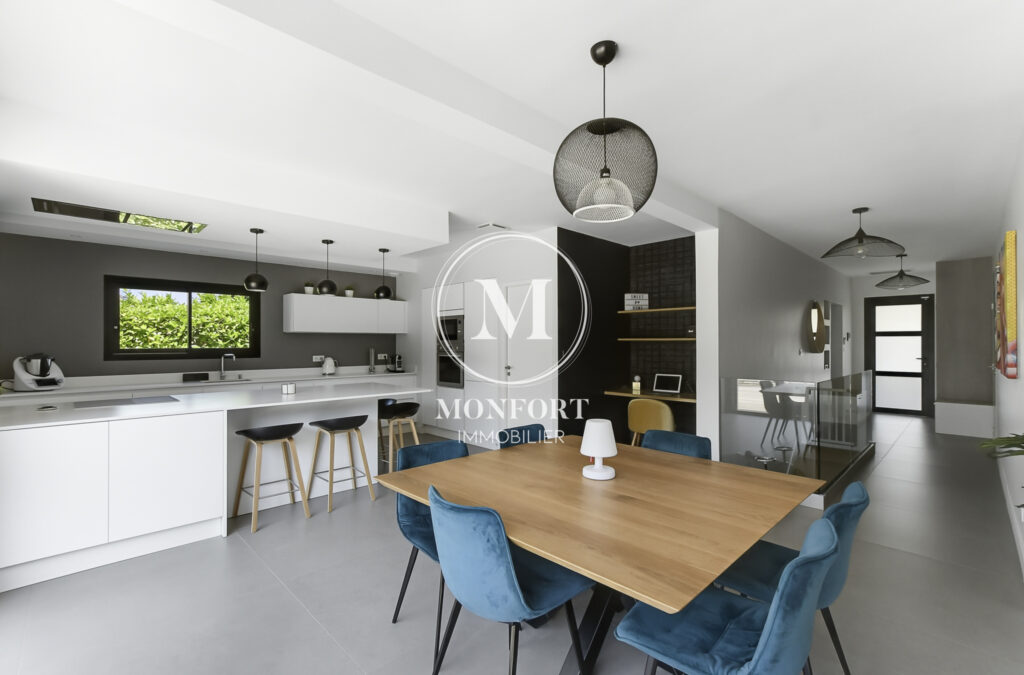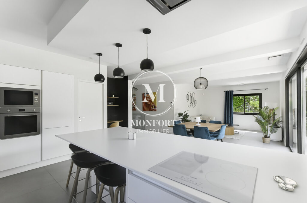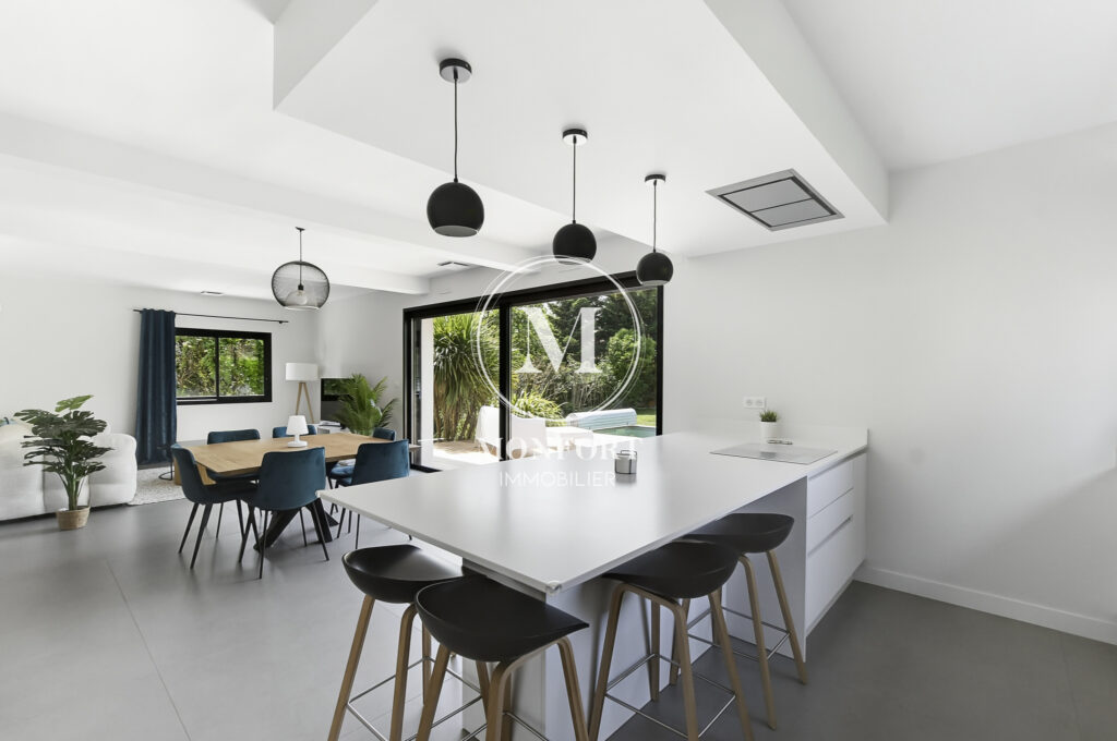 Dès l’entrée, vous serez séduit par les volumes, la lumière et les prestations soignées. La pièce à vivre de plus de 50 m2 intègre une très belle cuisine ouverte de qualité, entièrement équipée, avec un cellier attenant.