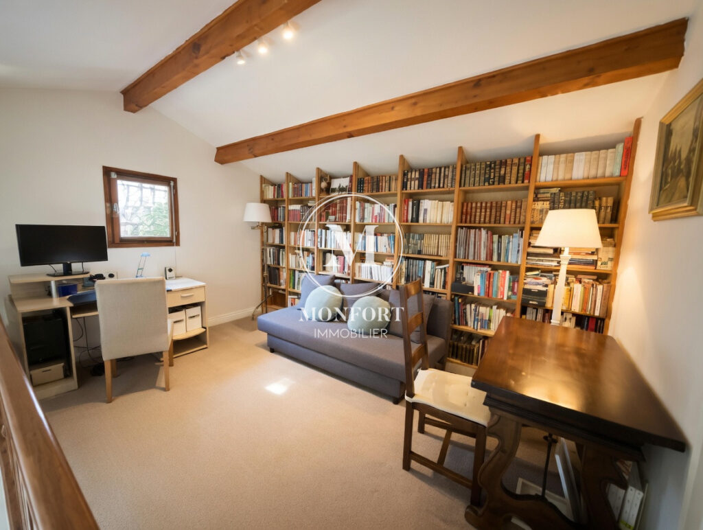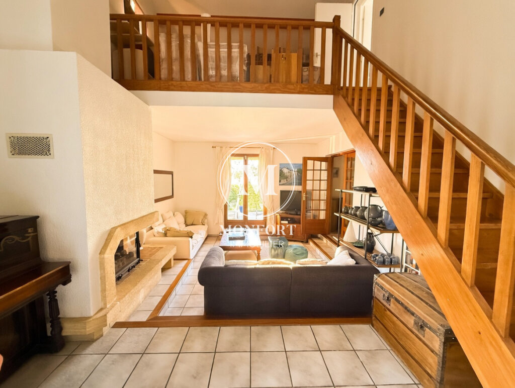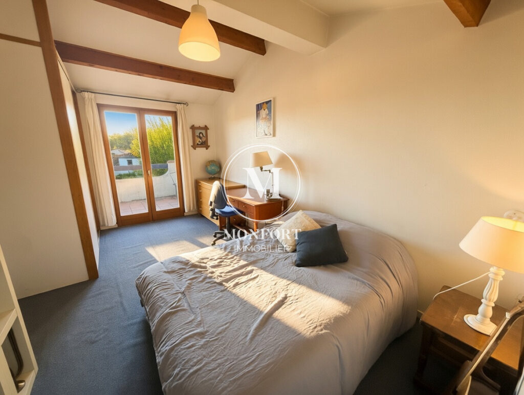 À l’étage, une mezzanine ouverte sur le séjour apporte un véritable cachet à la maison et peut facilement accueillir un espace bureau, salle de jeux ou bibliothèque. Vous y trouverez également une chambre avec sa salle de bain attenante et un balcon.